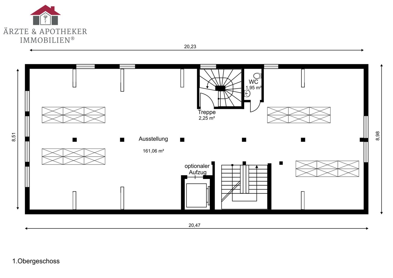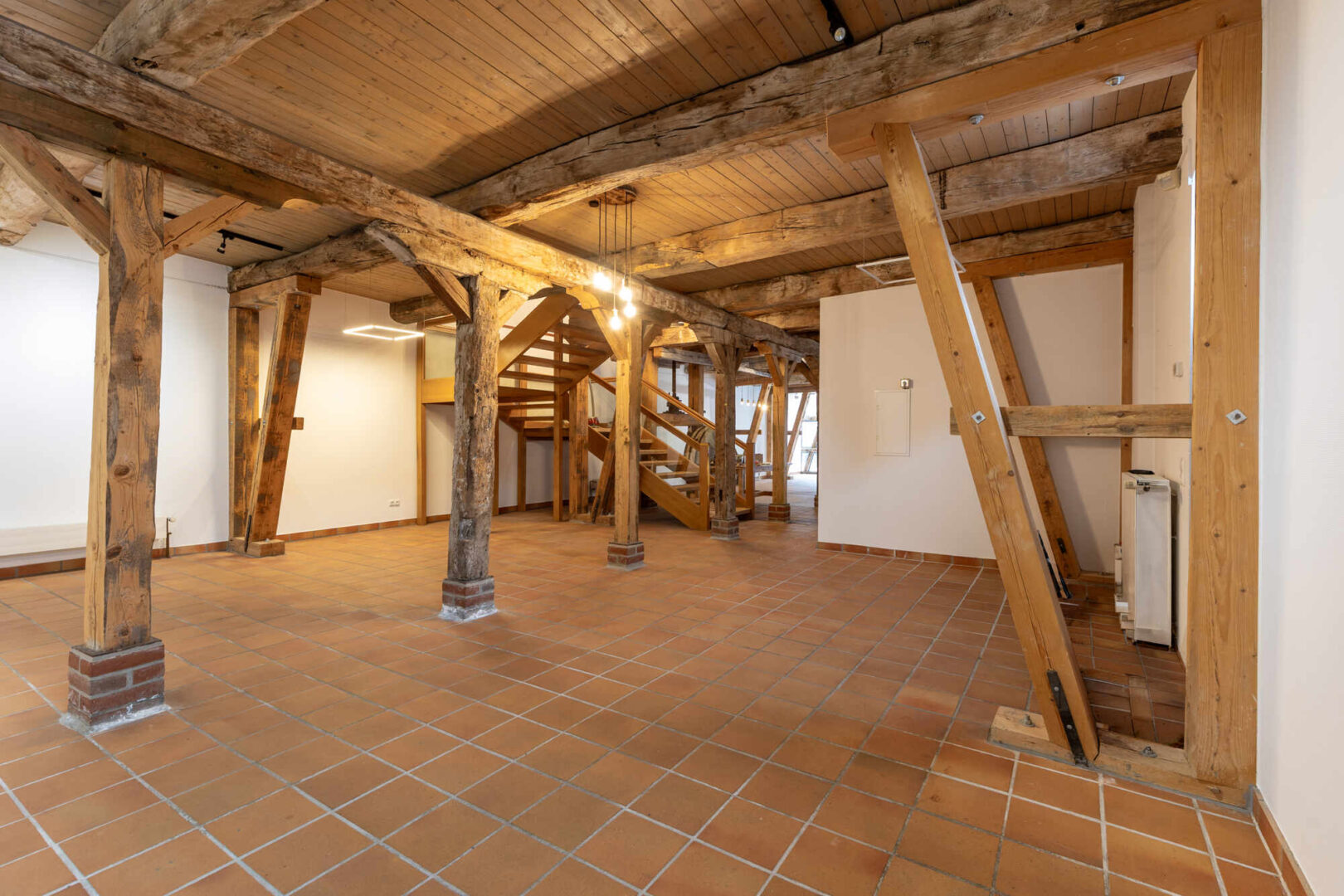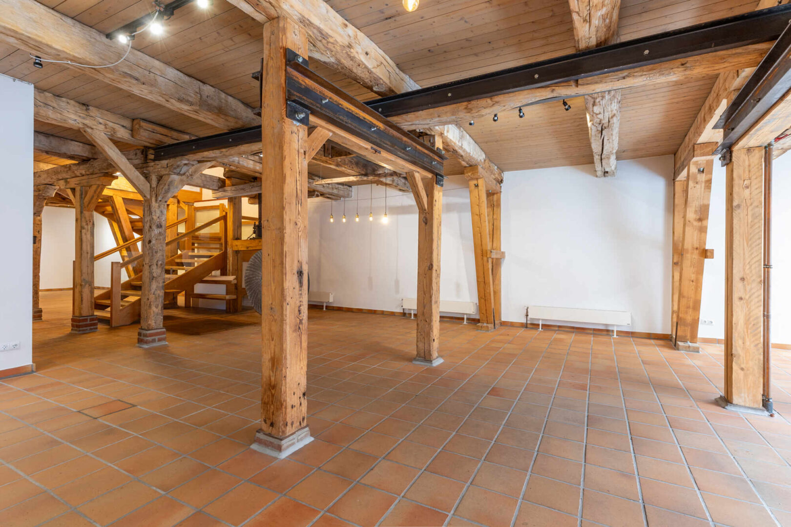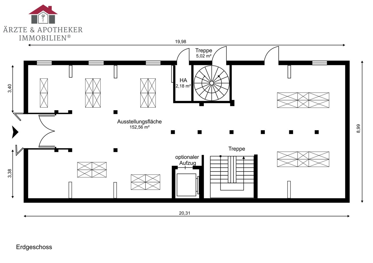 Das Erd- u. Obergeschoss sind mit dem Flair der ursprünglichen offenen Balkenlage ideale Präsentation- und Verkaufsflächen. Sie sind durch eine breite Eichenholztreppe direkt untereinander verbunden. Der Eingang zur Straße ist mit einer Luftschleieranlage versehen. Das Dachgeschoss ist optimal für Verwaltung, Lager und einfache Werkstattarbeiten geeignet. Ein separates Treppenhaus mit Nebeneingang verbindet alle drei Geschosse direkt. Im Ober- und Dachgeschoss befinden sich drei WC´s und eine Pantryküche.