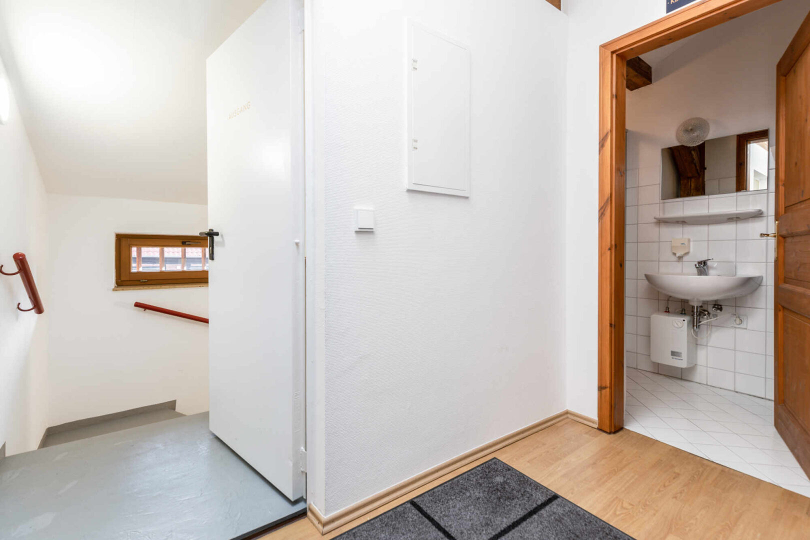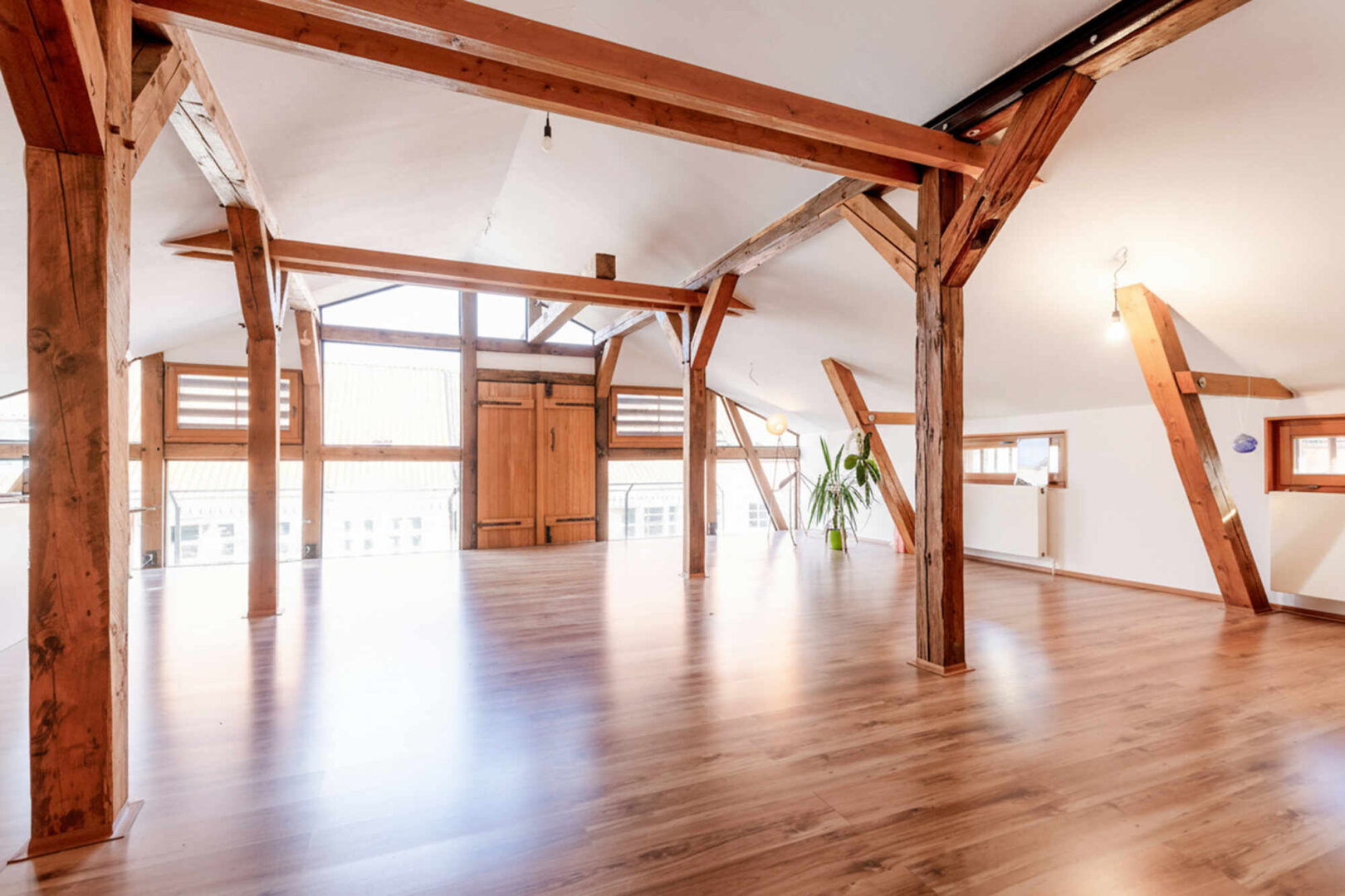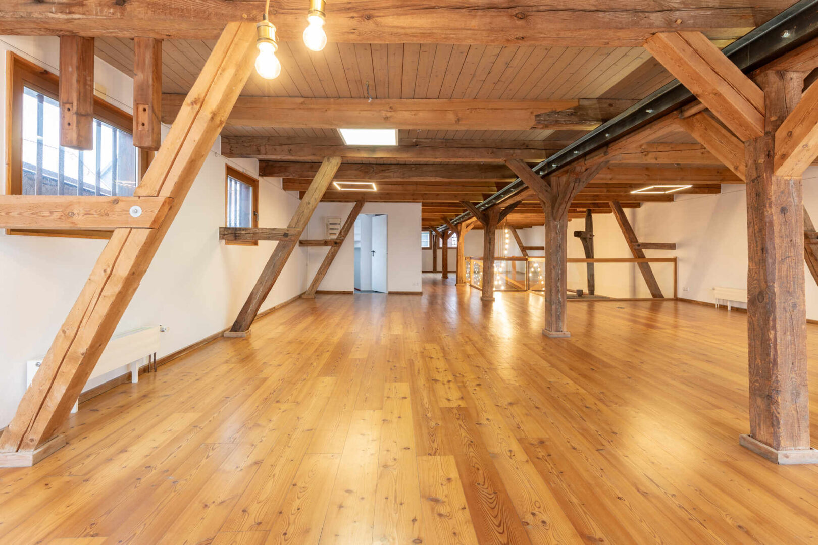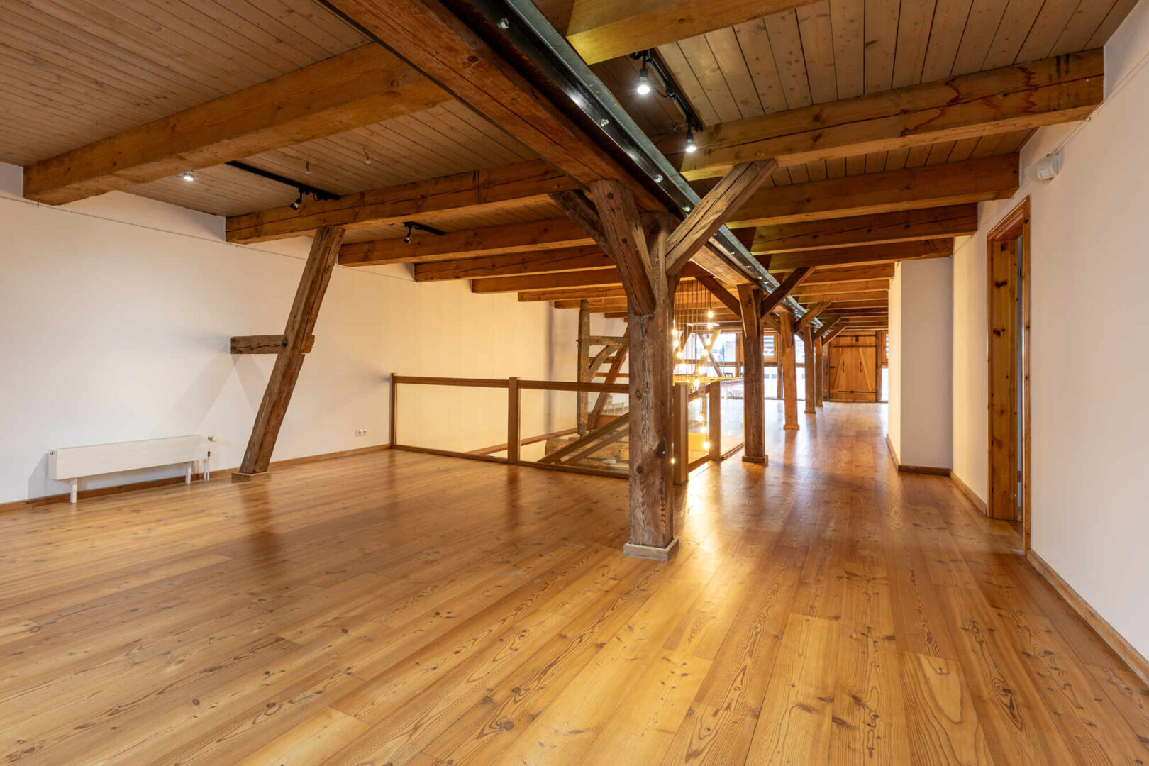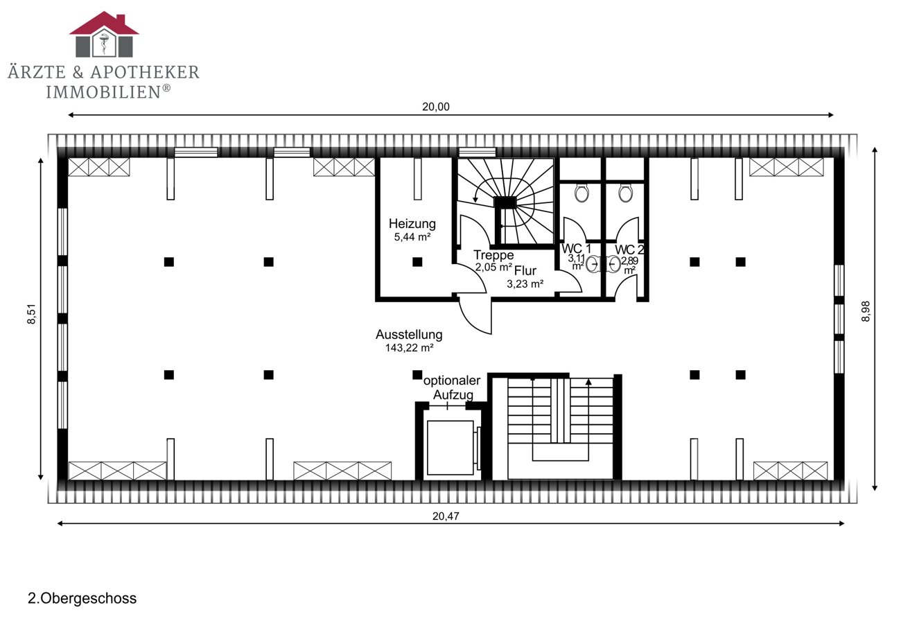 Das Erd- u. Obergeschoss sind mit dem Flair der ursprünglichen offenen Balkenlage ideale Präsentation- und Verkaufsflächen. Sie sind durch eine breite Eichenholztreppe direkt untereinander verbunden. Der Eingang zur Straße ist mit einer Luftschleieranlage versehen. Das Dachgeschoss ist optimal für Verwaltung, Lager und einfache Werkstattarbeiten geeignet. Ein separates Treppenhaus mit Nebeneingang verbindet alle drei Geschosse direkt. Im Ober- und Dachgeschoss befinden sich drei WC´s und eine Pantryküche.