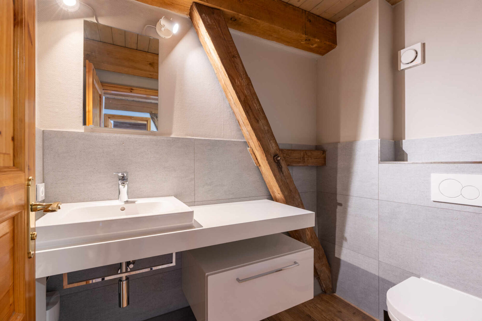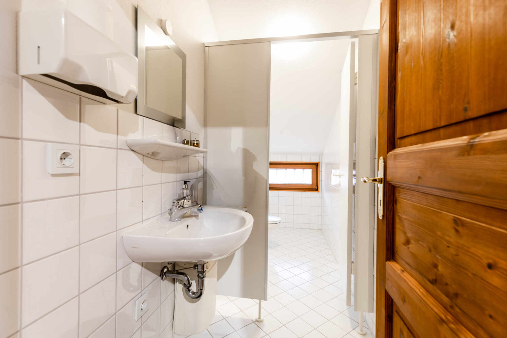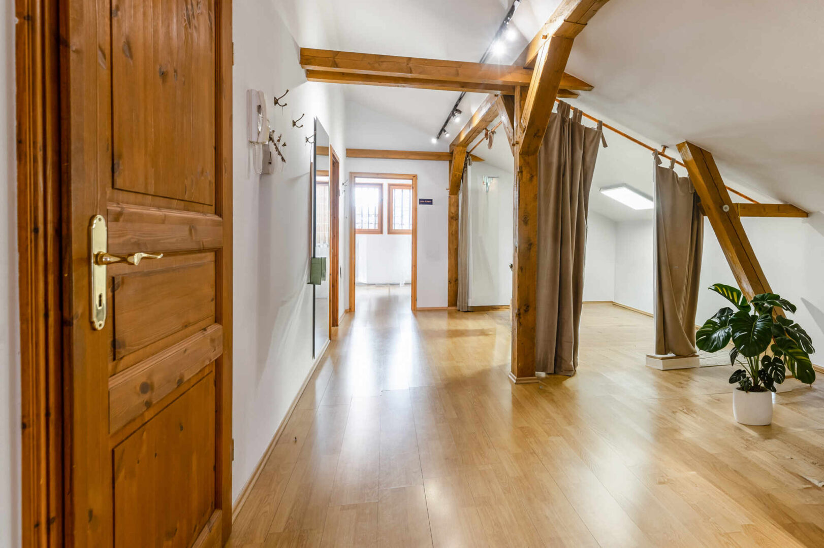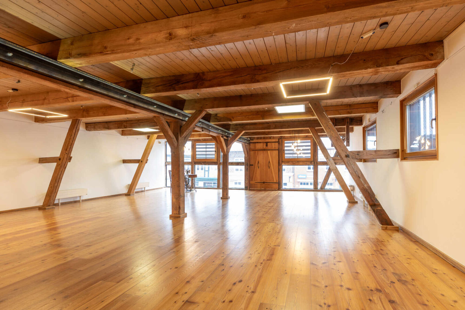 Das Erd- u. Obergeschoss sind mit dem Flair der ursprünglichen offenen Balkenlage ideale Präsentation- und Verkaufsflächen. Sie sind durch eine breite Eichenholztreppe direkt untereinander verbunden. Der Eingang zur Straße ist mit einer Luftschleieranlage versehen. Das Dachgeschoss ist optimal für Verwaltung, Lager und einfache Werkstattarbeiten geeignet. Ein separates Treppenhaus mit Nebeneingang verbindet alle drei Geschosse direkt. Im Ober- und Dachgeschoss befinden sich drei WC´s und eine Pantryküche.