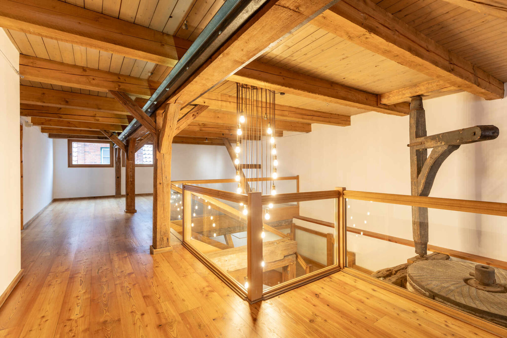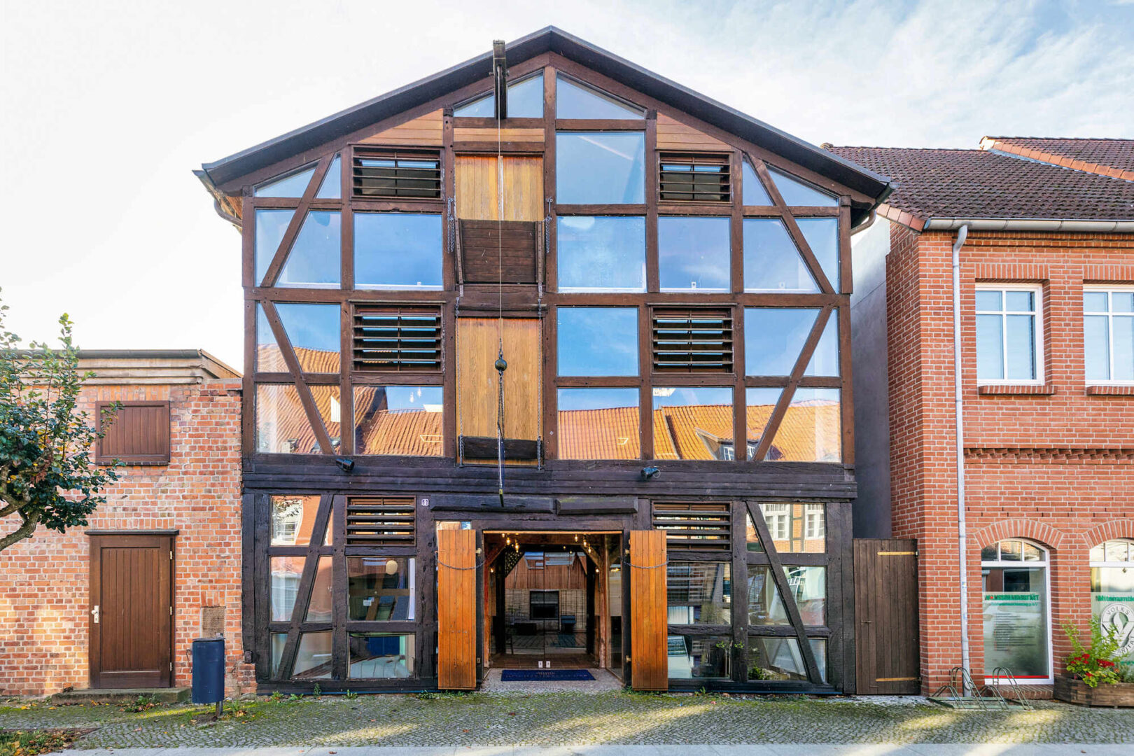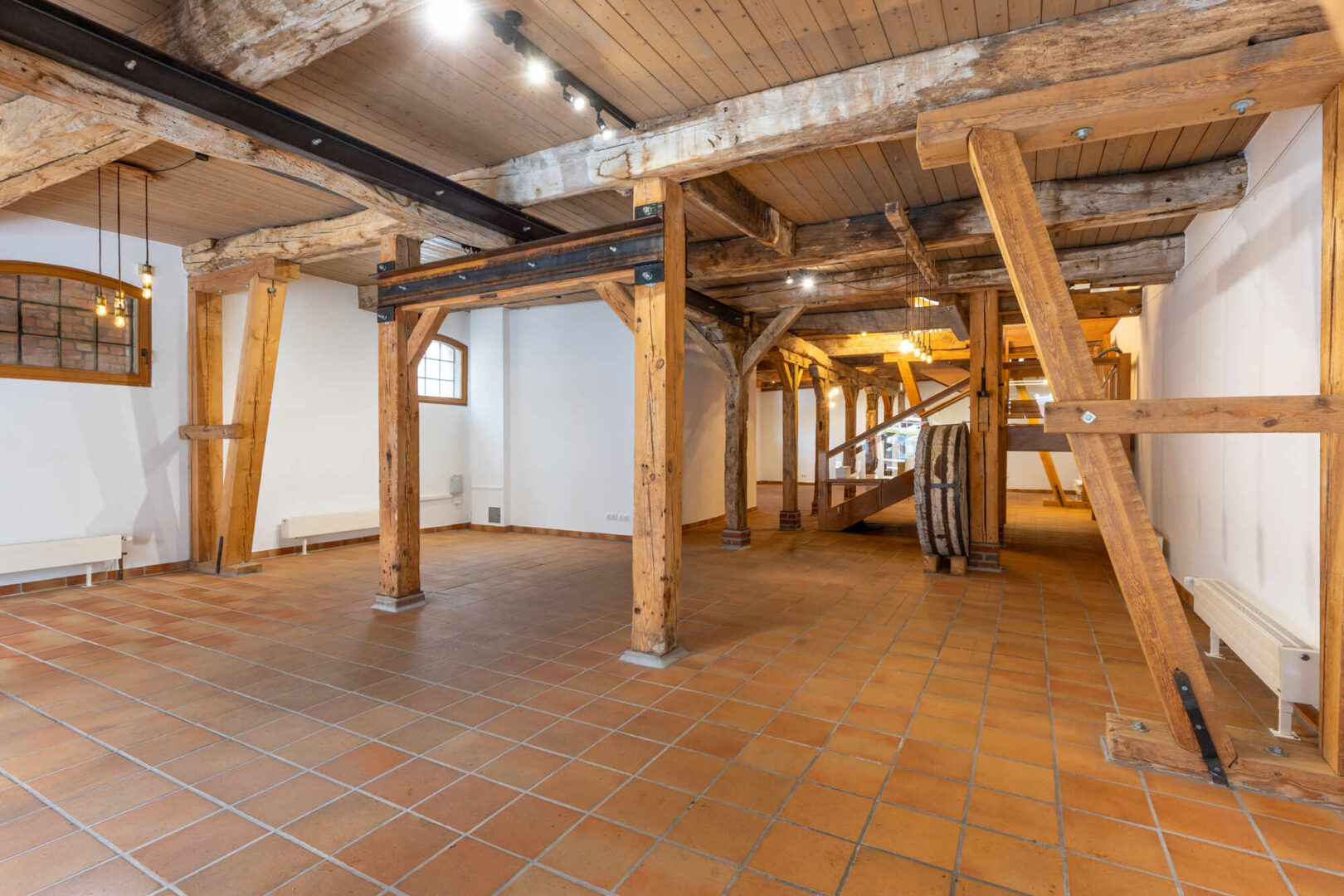 Diese faszinierende Gewerbeimmobilie zieht Sie auf den ersten Blick in ihren Bann. Hier wurde ein ehemaliger Kornspeicher aus der Gründerzeit zu einem, innen wie außen, repräsentativen Geschäftshaus um- und ausgebaut. Das gesamte Gebäude wurde 1996/97 aufwändig unter Beibehaltung alter Stilelemente saniert und modernisiert. Das Fachwerk der vorderen Fassade wurde ganzflächig verglast. Historische Einbauten wie Mahlwerk, Kranwinde, Fachwerk und Deckenbalken wurden erhalten.