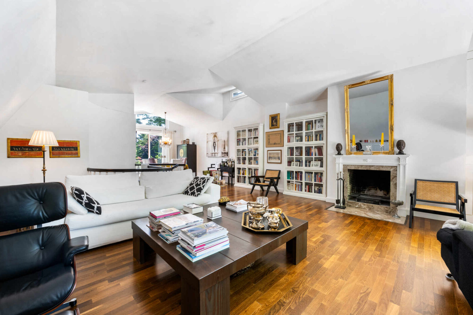 Das Herzstück der Wohnung bildet der großzügige Wohnbereich im oberen Geschoss mit imposanter Deckenhöhe, einem eleganten Kamin und Zugang zu zwei sonnigen Balkonen mit Blick ins Grüne. Die offen gestaltete Küche der Marke Miele ist ein echtes Highlight für Kochbegeisterte – ausgestattet mit Abluftsystem, Tepan-Yaki-Platte und hochwertigen Einbaugeräten.